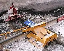 - (Chemin de fer) Appareil monté sur un rail permettant de protéger une voie en faisant dérailler tout train s’y engageant.