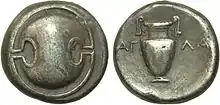« Statère au bouclier et au cratère », pièce de monnaie thébaine (2). Date : environ 360 av. J.-C. en Grèce antique.