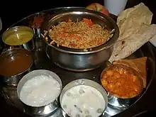 - (Cuisine) Repas indien ou pakistanais dont la composition diffère d’une région à l’autre, composé de plats servis généralement dans un ou plusieurs thalis.