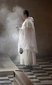 — (Joris-Karl Huysmans, En route, 1895)Il s'y trouve quatre chantres revêtus du pluvial ; deux céroféraires, deux thuriféraires ; le crucifère revêtu de la tunique.