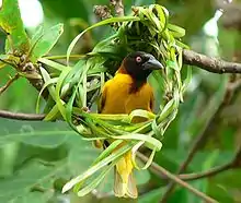 Tisserin gendarme (Ploceus cucullatus) mâle dans son nid en cours de confection.