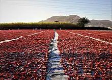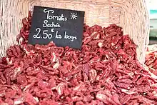 - Tomate, généralement d'une variété spécifique, coupée en deux longitudinalement puis séchée, habituellement au soleil. Elles peuvent être commercialisée sèches, ou légèrement réhydratées et mise à tremper dans de l'huile avec des aromates.