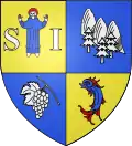- Écartelé : au premier d’or à un saint d’argent vêtu d’azur et nimbé de gueules, les deux avant-bras tournés vers le chef, adextré de la lettre S et senestré de la lettre I le tout d’argent, au deuxième d’azur à trois monts d’argent rangés en bande et, brochant sur le tout, trois sapins également d’argent et rangés vaguement en bande, au troisième d’azur à une grappe de raisin fruitée, feuillée et tigée d’argent, au quatrième d’or à un dauphin d’azur, crêté, barbé, loré, peautré et oreillé de gueules, qui est de Saint Ismier → voir illustration « bras tournés »
