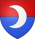 - Coupé de gueules et d’azur, au croissant tourné d’argent brochant sur la partition, qui est de Ranspach → voir illustration « croissant tourné »