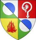 - Écartelé : au premier et au quatrième tranché d’argent et de sinople au tourteau-besant tranché d’azur et d’argent brochant sur la partition ; au deuxième de gueules à la crosse d’argent mouvant de la pointe ; au troisième d’or au feu allumé de gueules, qui est de la commune de Malbuisson du Doubs → voir illustration « armoiries avec 2 tourteau-besant »