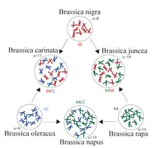 — (Nathalie Cousin, Brocoli et autres crucifères : Un concentré de bienfaits pour votre santé, votre beauté et votre jardin, 2012)Le triangle de U (1935) schématise les relations entre certaines espèces de Brassicacées […]. Il est possible de recréer les Brassicacées allopolyploïdes.