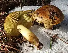 - (Mycologie) Espèce de champignons à lames assez serrées et inégales, au chapeau à marge ondulée jaune brunâtre, et au pied sans anneau, trapu, jaune.