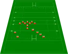 Position des joueurs sur le terrain. Les troisième ligne aile sont numérotés 6 et 7