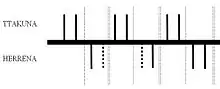 - (Musique) Joute musicale à quatre mains composée de deux cycles binaires. Chaque joueur joue alternativement son cycle. Le premier joueur, ttakuna, donne le tempo initial et le maintient. Le deuxième joueur, herrena, réalise les déséquilibres en introduisant, dans le rythme, des doubles, triples ou quadruples coups permettant ainsi de multiples combinaisons.