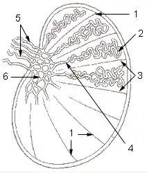 Schéma d'un testicule : 2. tube séminifère 4. tube droit 6. rete testis 5. canaux efférents.