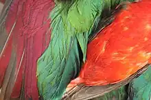 L'uroporphyrine III-Cu(II) est responsable de la pigmentation rouge cramoisi de la plume d'un touraco (à gauche); aux fins de comparaison, le rouge de la plume d'un tangara du Brésil (à droite) est produit par des caroténoïdes, tandis que le pigment vert d'une plume de touraco (au centre), ou turacoverdine est probablement un produit de l'oxydation de l'uroporphyrine III-Cu(II).