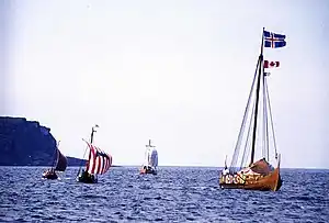 Víkingaskipið Íslendingur kemur að landi í L'Anse aux Meadows á Nýfundnalandi árið 2000 (Le bateau viking Íslendingur arrivant dans la région de l’Anse de Meadows à Terre-Neuve en 2000).