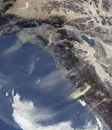 Panaches de poussières et de fumée montrant les sorties de vallées où souffle le vent de Santa Ana.
