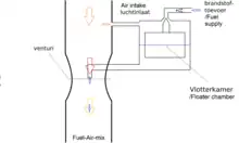 - (En particulier) (Mécanique) Rétrécissement de la buse entourant le gicleur dans un carburateur.