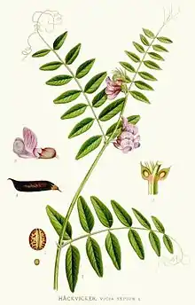 - (Botanique) Espèce de vesce, plante grimpante à feuilles pennées aux folioles oblongues, et aux grappes de fleurs bleu violacé ou rouge lilas.