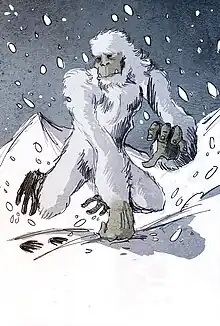 - (Mythologie) Animal mythologique censé vivre dans les montagnes du Tibet, conformé comme un primate velu au poil blanc, avec un visage ressemblant à celui de l’homme.
